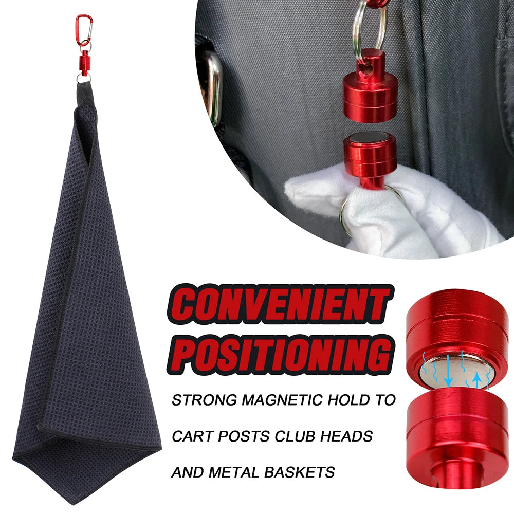 What sets it apart? A powerful industrial-grade magnet embedded in the towel allows you to instantly attach it to your golf cart, clubs, or any metal surface. No clips, no fumbling – just grab and go.